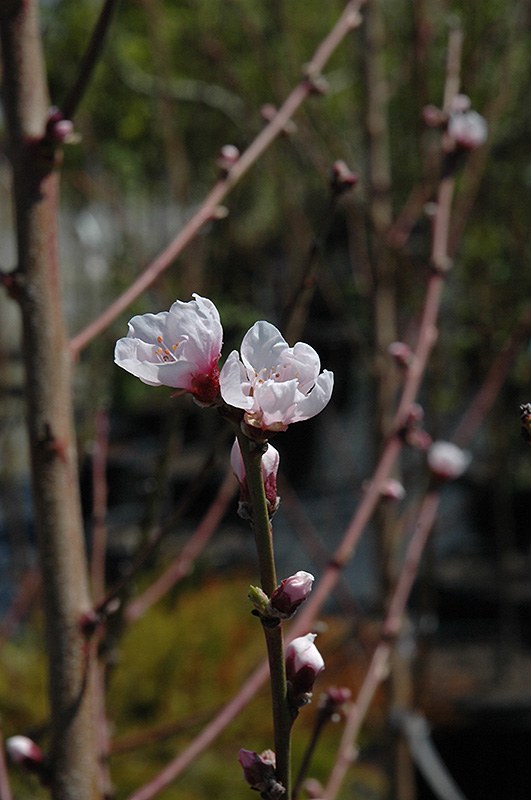 A large freestone peach with an even red flush when ripe; firm, sweet and juicy; very showy soft pink blooms in spring