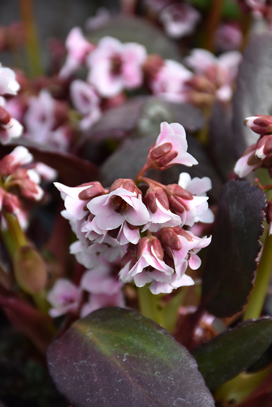 Dragonfly™ Angel Kiss Bergenia features unusual spikes of white bell-shaped flowers with shell pink overtones rising above the foliage from early to mid spring. The flowers are excellent for cutting. Its attractive large succulent round leaves are dark green in color with curious red undersides. As an added bonus, the foliage turns a gorgeous burgundy in the fall. The dark red stems can be quite attractive.