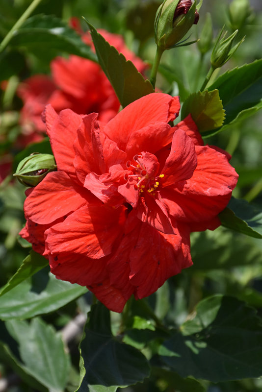 Double Red Hibiscus features bold double red round flowers with yellow anthers at the ends of the branches from mid summer to early fall. Its glossy pointy leaves remain dark green in color throughout the year.