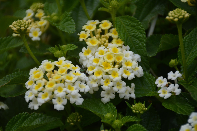 Bandana® White Lantana features showy cymes of white flowers with yellow overtones at the ends of the branches from early summer to mid fall. Its tomentose pointy leaves remain dark green in color throughout the year.