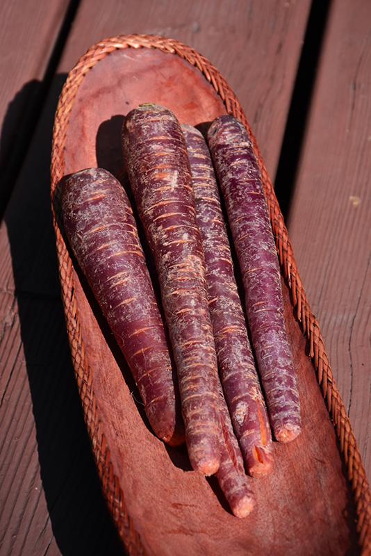 A beautiful imperator shaped selection, great for large containers, raised beds and gardens; produces 12" long, dark purple carrots with bright orange interiors; perfectly sweet and crunchy, great raw in salads or sacks, or cooked in any dish