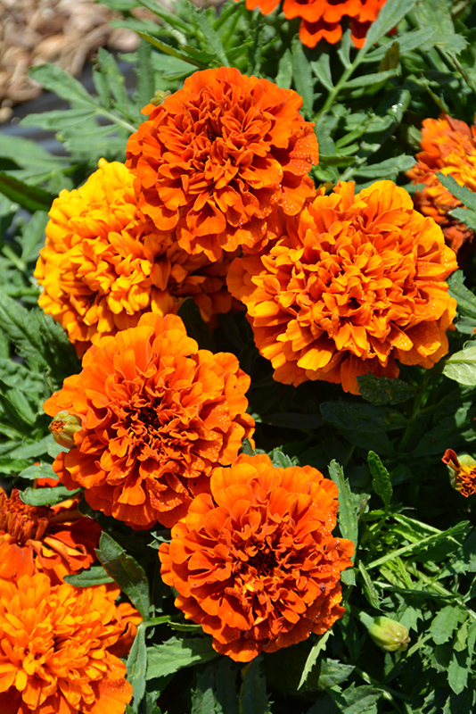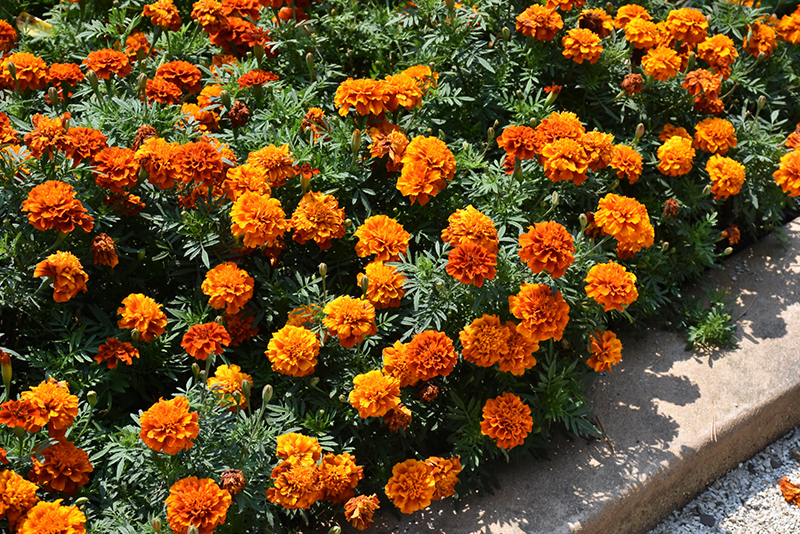 A wonderful multicolored, mounded variety ideal for borders, containers and landscapes; deep red blooms that transition to coppery-orange and finally mature to deep gold stand out against green fern-like foliage; deadhead to encourage consistent blooming