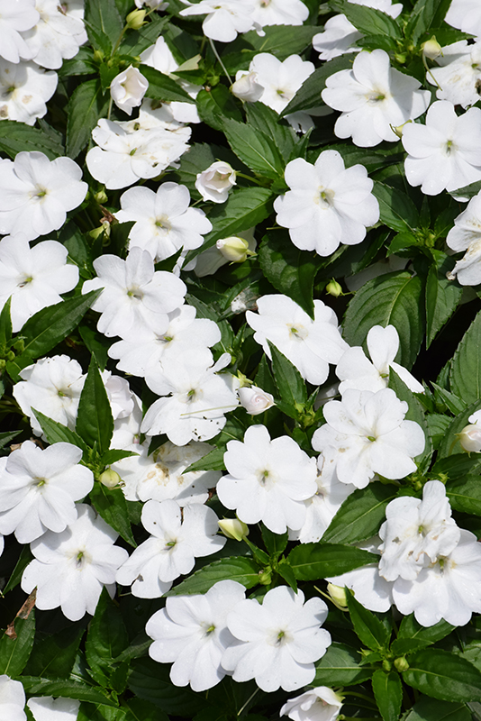 SunPatiens® Compact Classic White Impatiens features bold white round flowers at the ends of the stems from mid spring to early fall. Its pointy leaves remain dark green in color throughout the season.