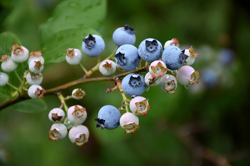 Highbush Blueberry features dainty clusters of white bell-shaped flowers with shell pink overtones hanging below the branches in mid spring. It has green deciduous foliage. The glossy oval leaves turn an outstanding scarlet in the fall. It features an abundance of magnificent blue berries in mid summer. The smooth brick red bark adds an interesting dimension to the landscape.